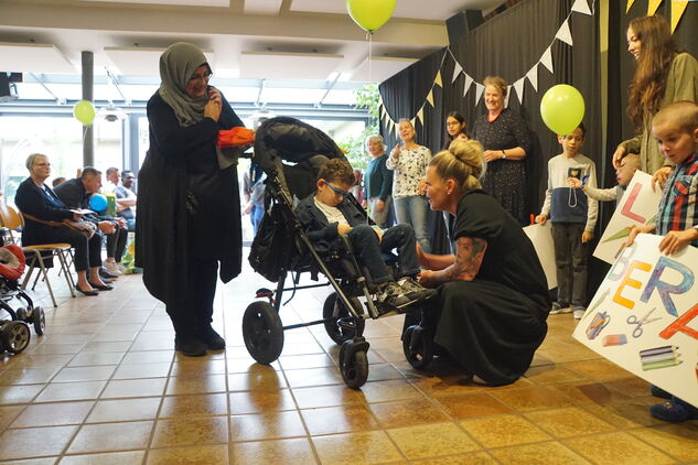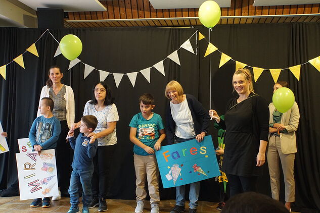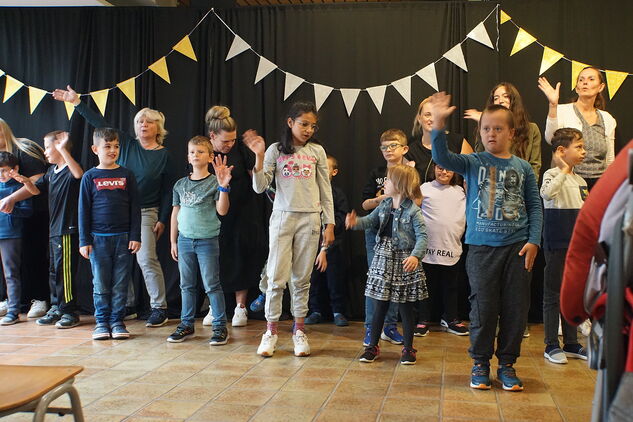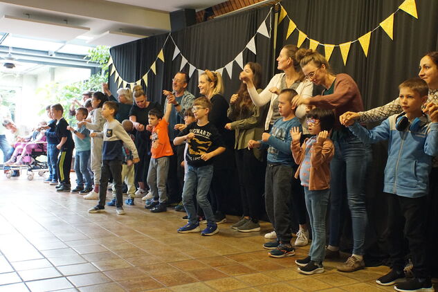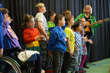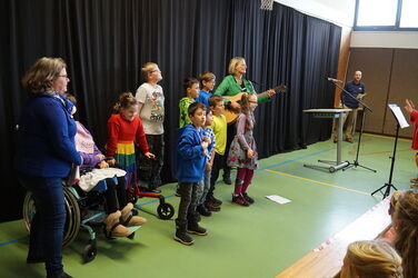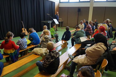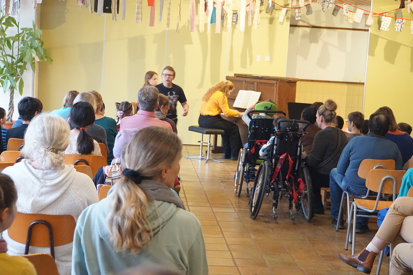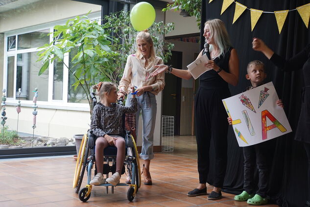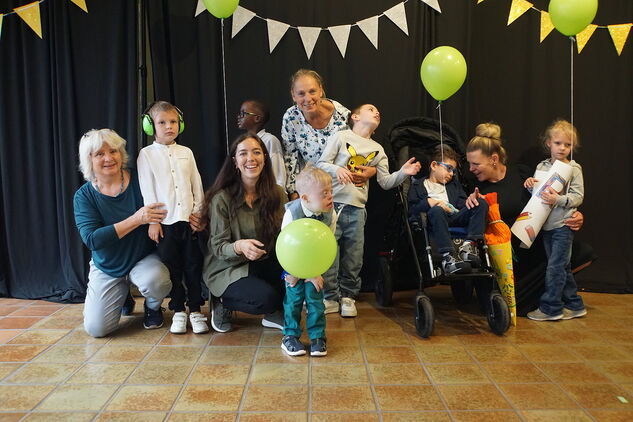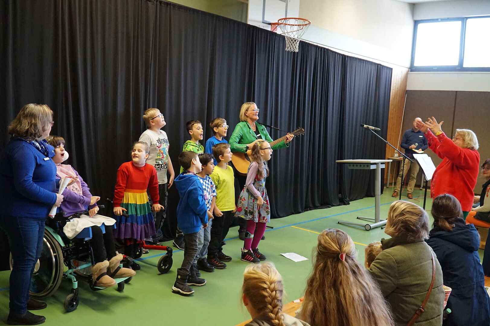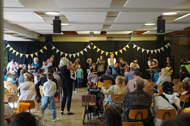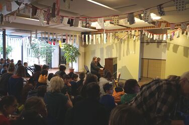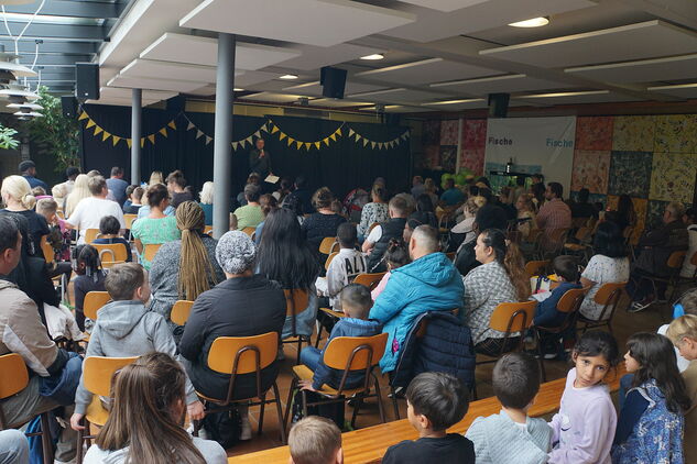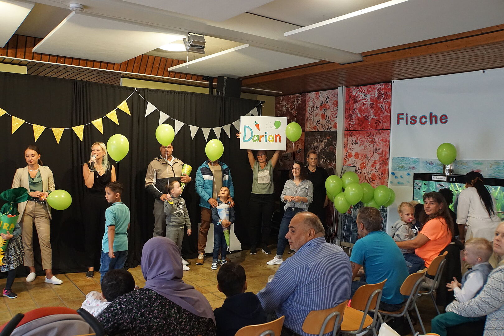 Nach ein paar Worten der Stufenleitung und der Schulleitung hat die gesamte Grundstufe der Haldenwang-Schule die neuen Schülerinnen und Schüler mit drei Tänzen und viel Motivation willkommen geheißen. Die einzelnen Erstklässler*innen wurden von ihren neuen Klassenlehrerinnen nacheinander in Empfang genommen und von allen mit einem kurzen Lied begrüßt. Danach gab es für die Familien der neuen Schüler*innen noch Kaffee und Kuchen.