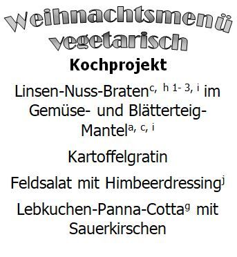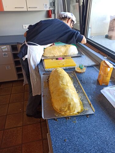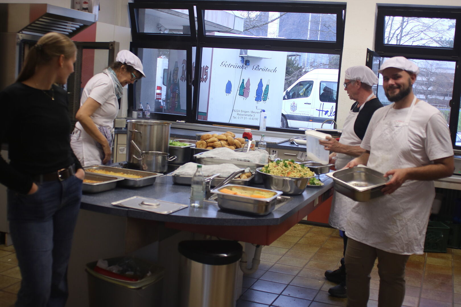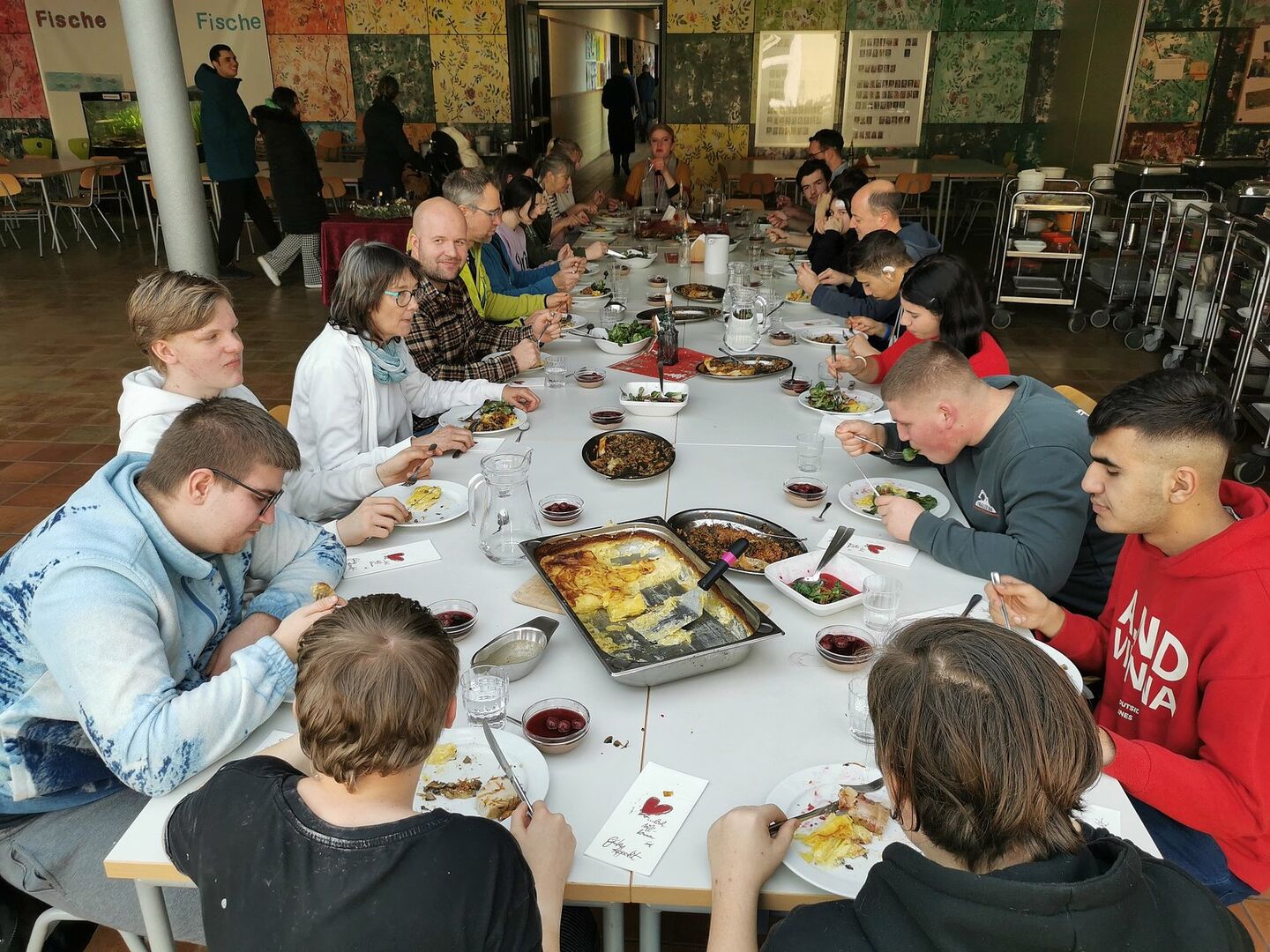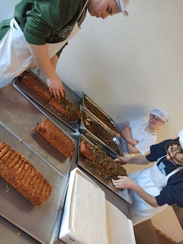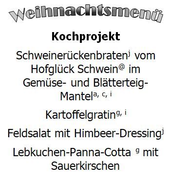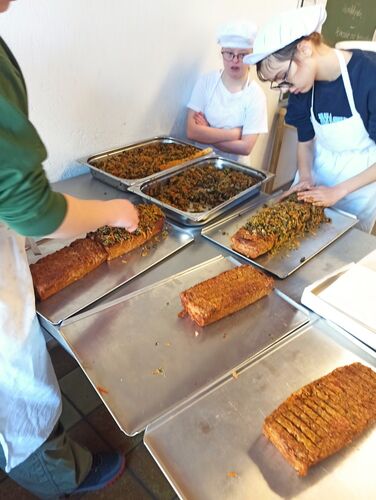 Am Dienstag vor den Weihnachtsferien kochte das Kochprojekt für die gesamte Schule, das waren an diesem Tag 150 Leute, ein besonderes Weihnachtsmenü. Es klappte alles gut und war auch fast rechtzeitig fertig. Es gab Schweine- oder Nussbraten mit Kartoffelgratin, Feldsalat und als Nachtisch ein Lebkuchen-Panna-Cotta. Das Kochprojekt besteht aus Schülerinnen und Schülern der Berufsschulstufe und der BVE. Dabei wird für alle Schülerinnen und Schüler der Haldenwang-Schule unter Anleitung von Frau Klawiter das Mittagessen gekocht..
