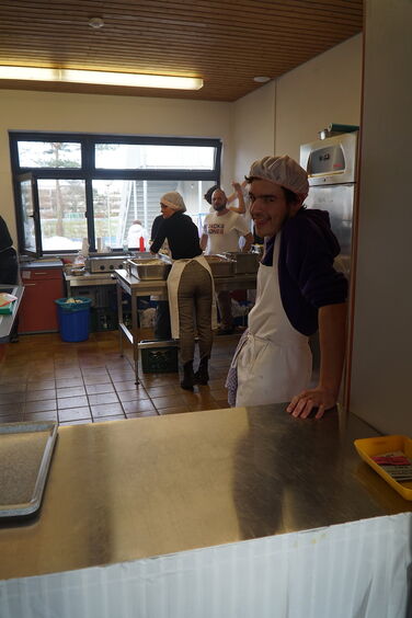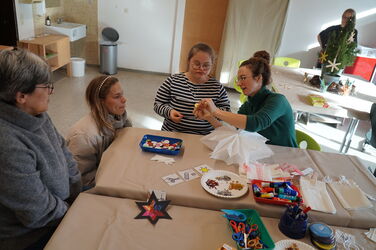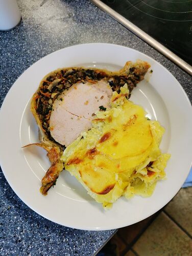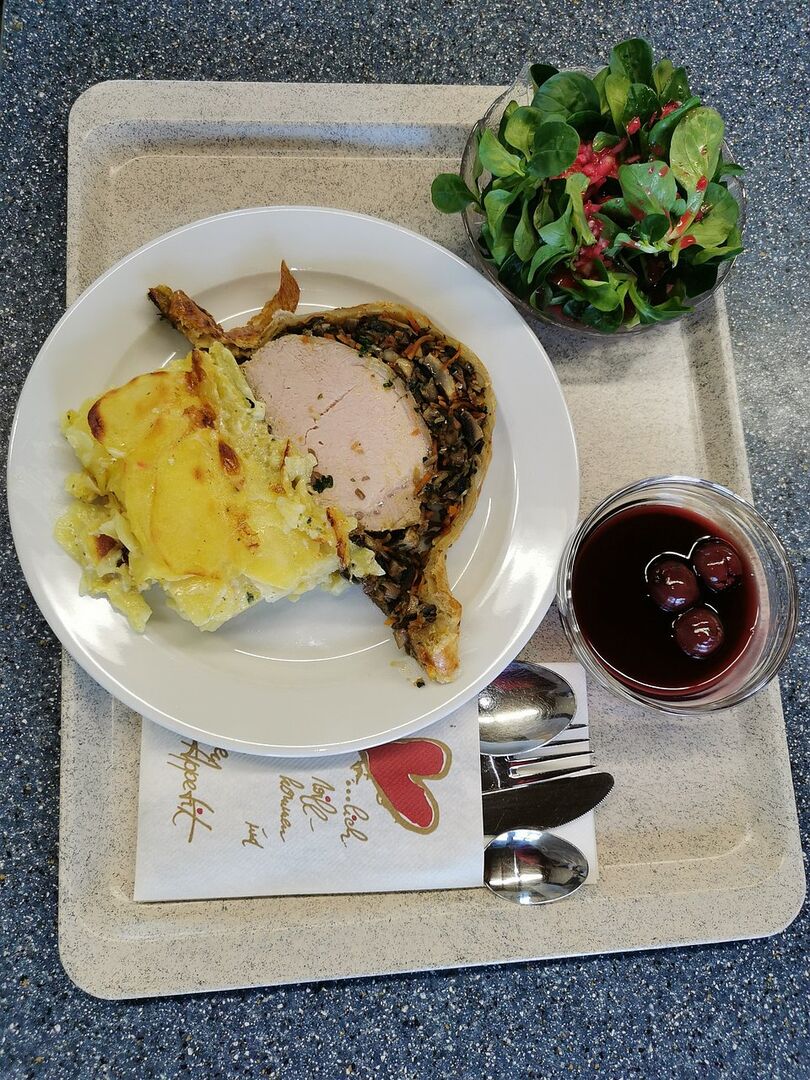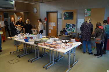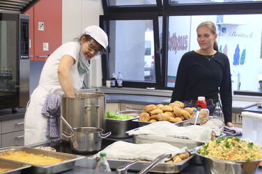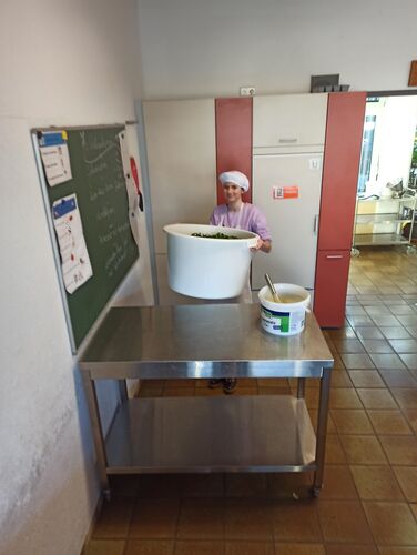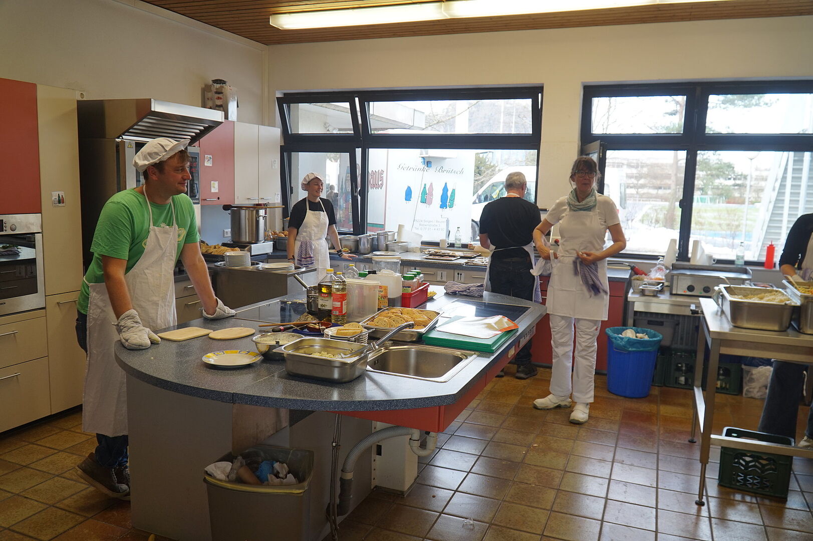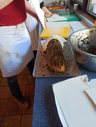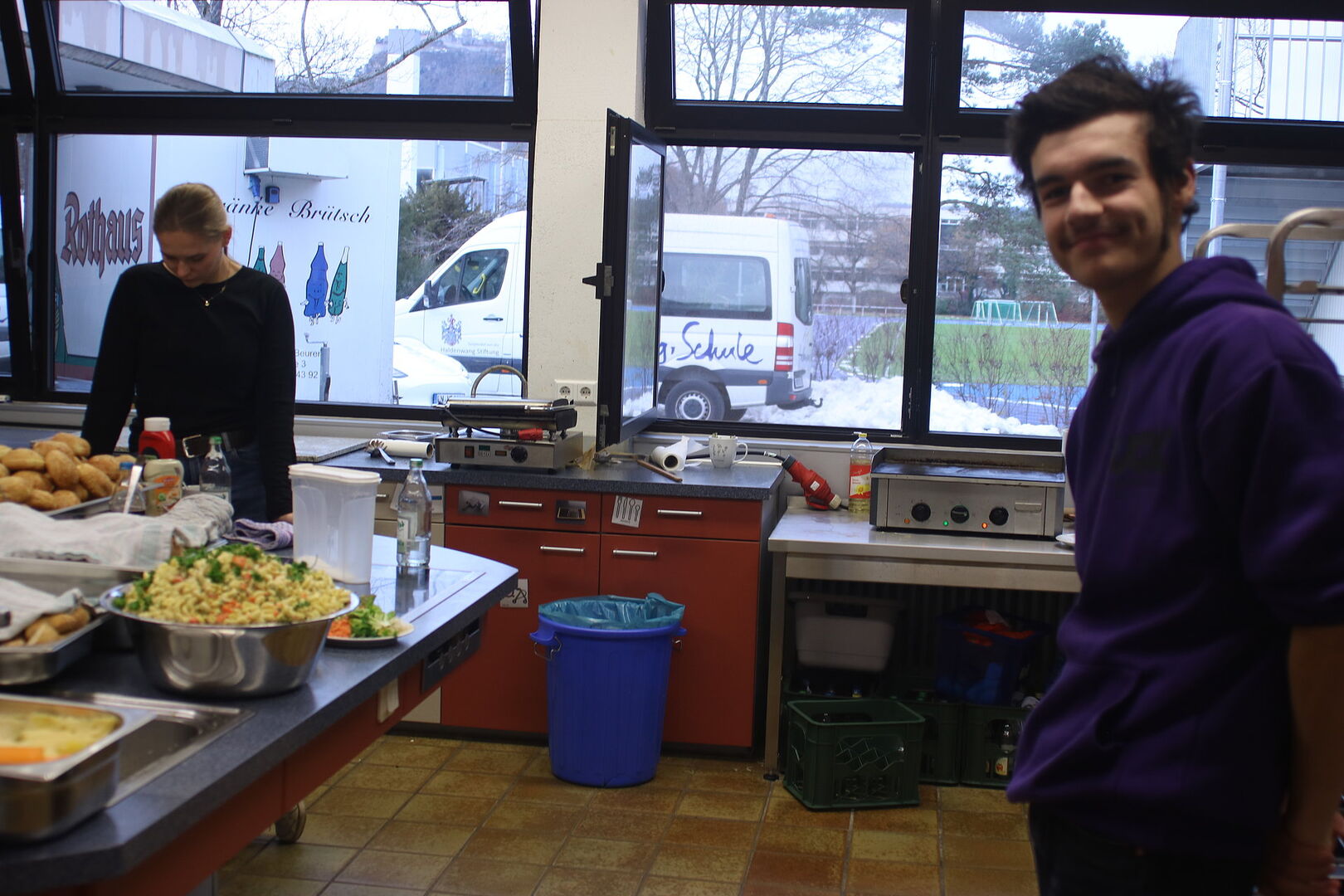 Am Dienstag vor den Weihnachtsferien kochte das Kochprojekt für die gesamte Schule, das waren an diesem Tag 150 Leute, ein besonderes Weihnachtsmenü. Es klappte alles gut und war auch fast rechtzeitig fertig. Es gab Schweine- oder Nussbraten mit Kartoffelgratin, Feldsalat und als Nachtisch ein Lebkuchen-Panna-Cotta. Das Kochprojekt besteht aus Schülerinnen und Schülern der Berufsschulstufe und der BVE. Dabei wird für alle Schülerinnen und Schüler der Haldenwang-Schule unter Anleitung von Frau Klawiter das Mittagessen gekocht..