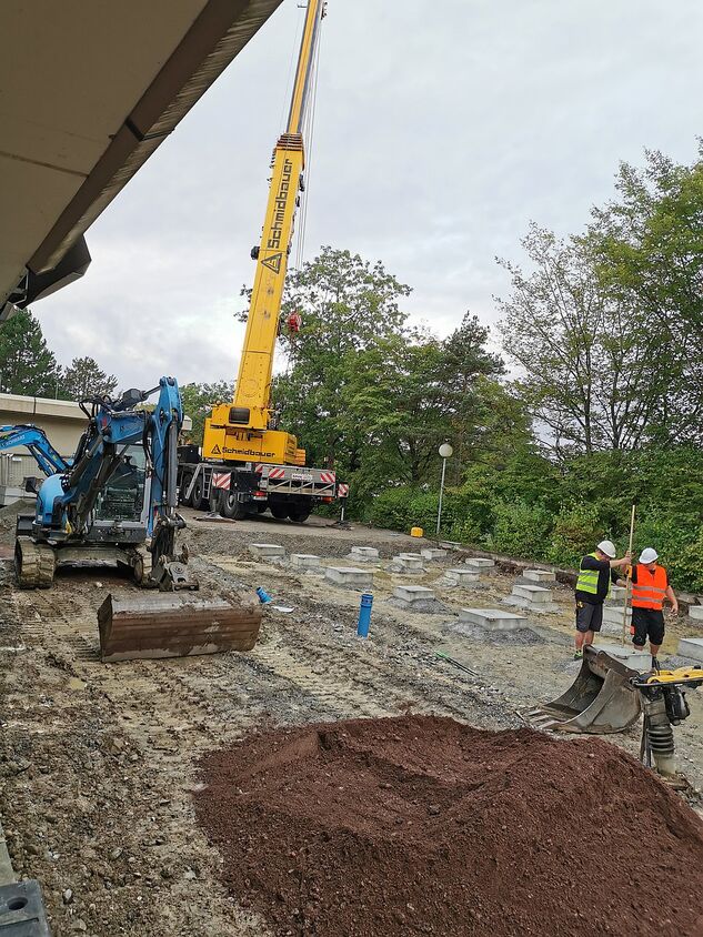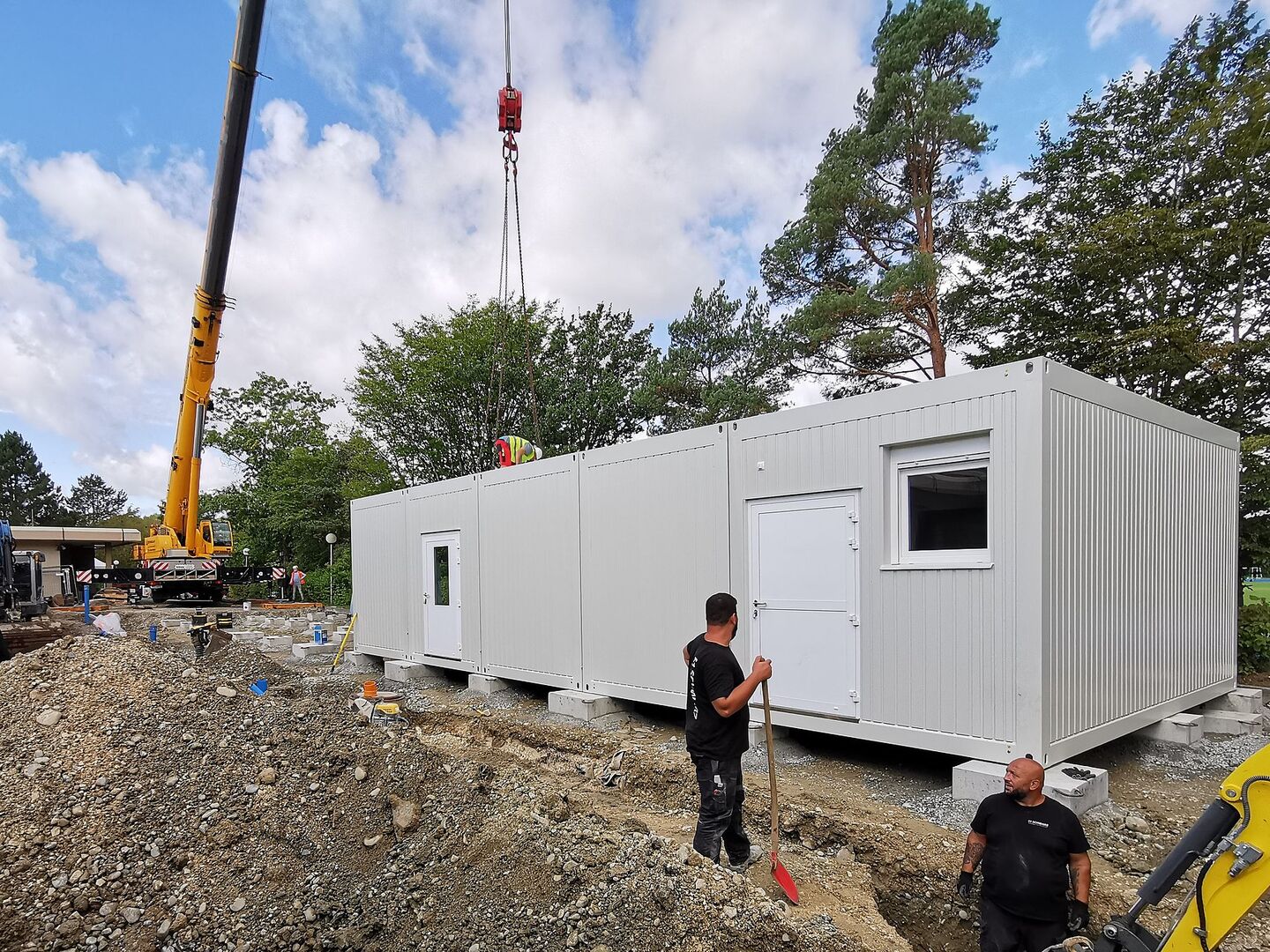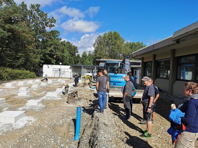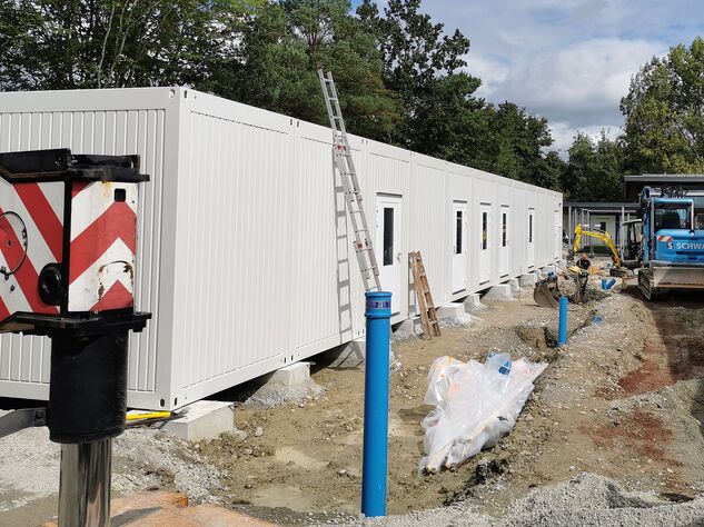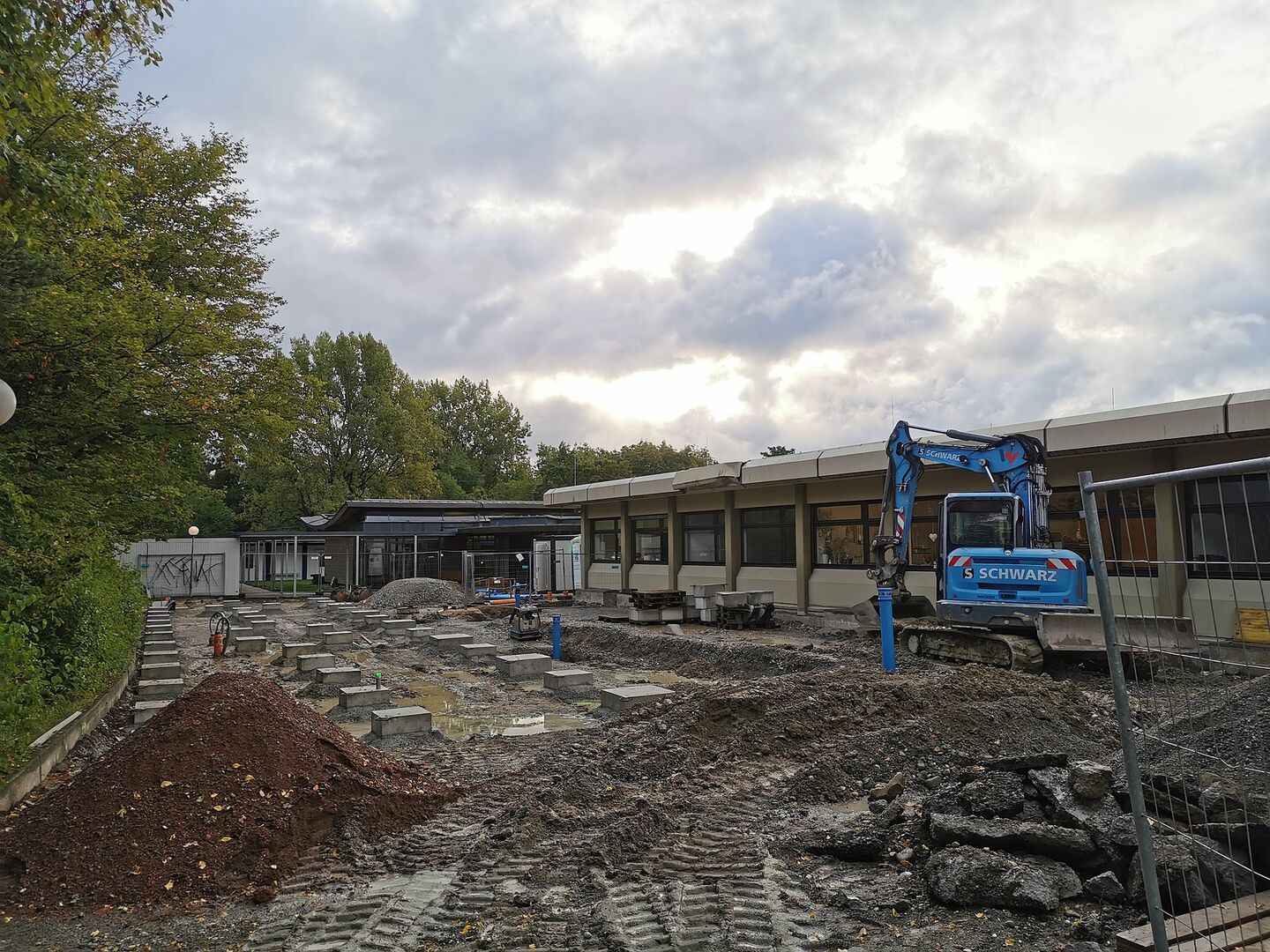 Zum neuen Schuljahr bekommt die Haldenwang-Schule vier neue Container-Klassenzimmer, inklusive Pflegeräumen. Deshalb ist derzeit eine große Baustelle, wo früher der vordere Schulhof war. Es wird von vielen Handwerkern fleißig gearbeitet, damit die Schülerinnen und Schüler bald in den Containern unterrichtet werden können. Die Handwerker arbeiten richtig supergut! Vorübergehend findet der Unterricht in den Fachräumen der Schule statt, welche zu Klassenräumen umgeräumt und eingerichtet wurden.