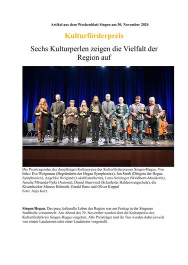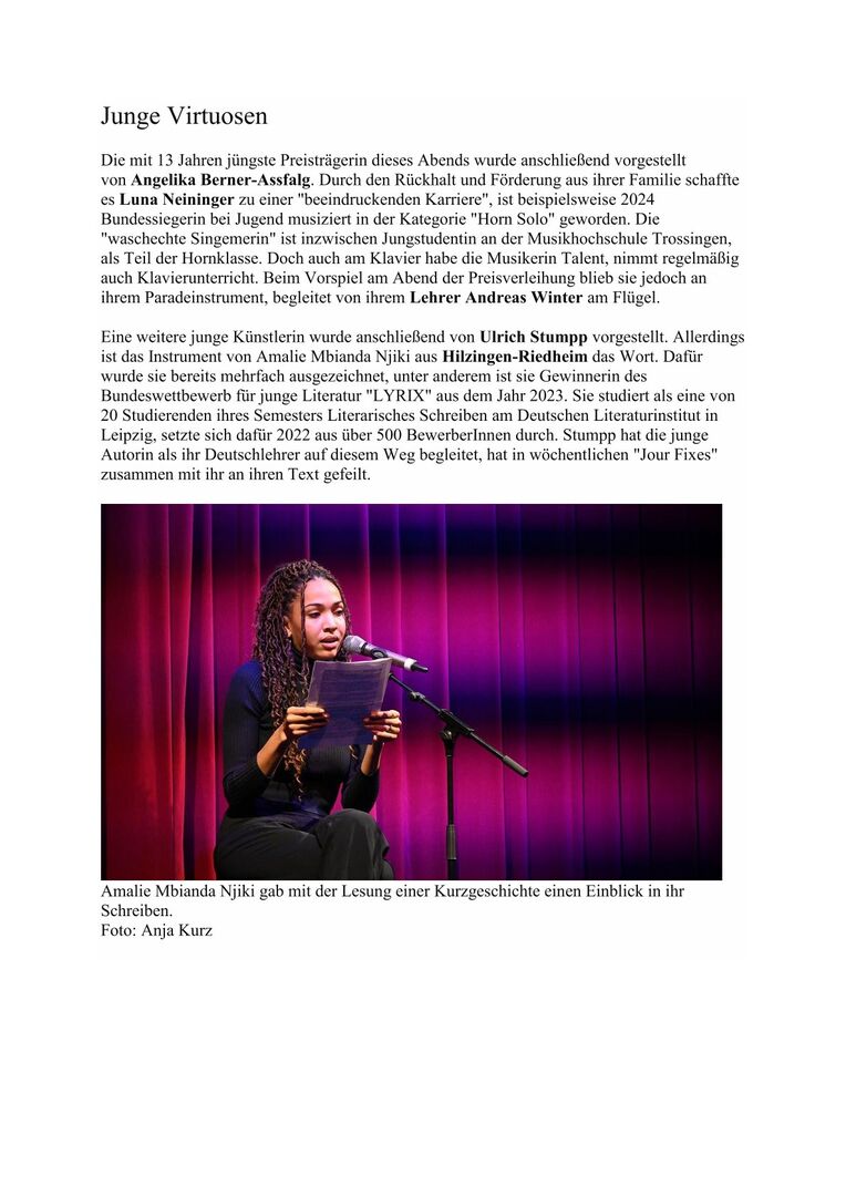 Die Pianistin Antonia Miller sowie die Pianistin Cristina Marton, welche an der Musikschule in Singen und an der Musikhochschule in Augsburg unterrichtet, brachten neun talentierte junge Musikerinnen und Musiker mit. Diese machen derzeit teilweise Musik-Abitur, teilweise nehmen sie an "Jugend musiziert" teil und bieteten gemeinsam mit den Pianistinnen eine außergewöhnliche Mischung an anspruchsvollen Stücken dar.